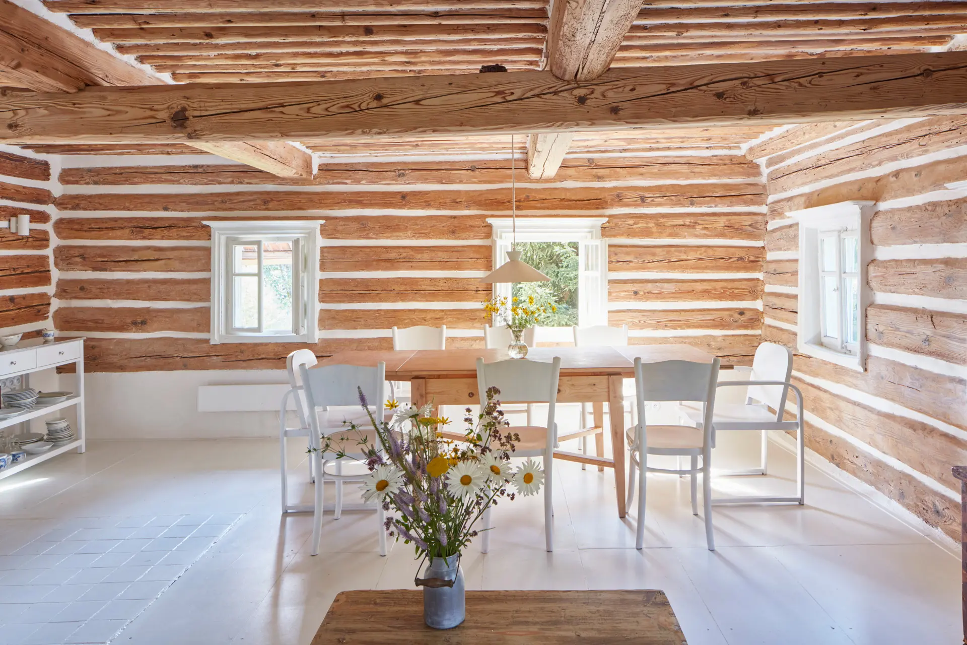 Nejvýraznější prvek místnosti je dostavěná historická pec. Taky je tu velký stůl, ke kterému se pohodlně vejdete úplně všichni. A pod okny světnice není nic než les.