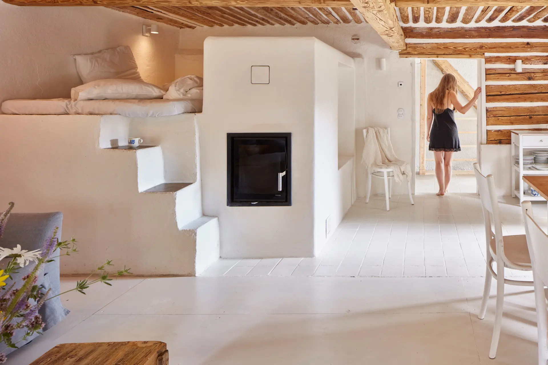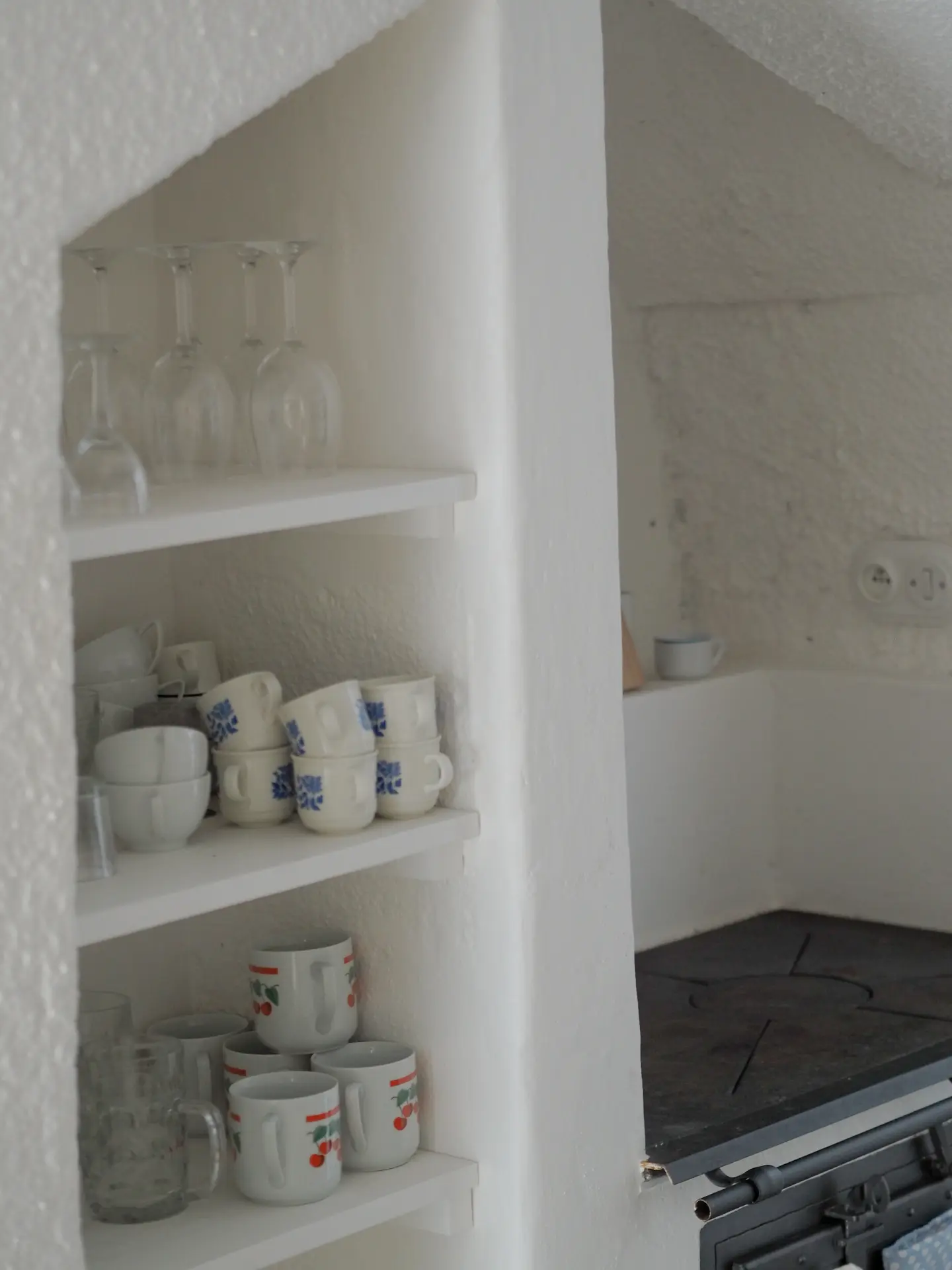 Kamna na dřevo vás vrátí v čase, ale najdete tady i veškeré pohodlí současnosti jako je indukce, myčka na nádobí, mlýnek na kávu, sadu na filtr a kávovar na kapsle. Zkusíte tady v troubě upéct koláč?