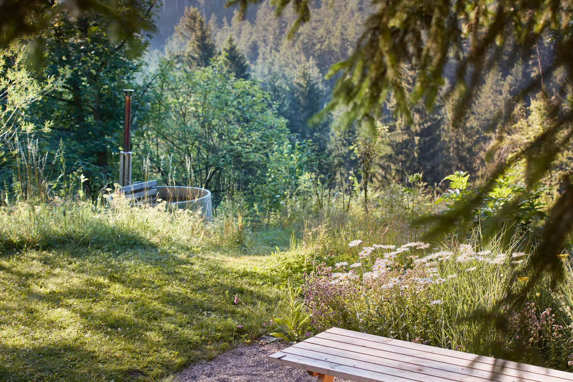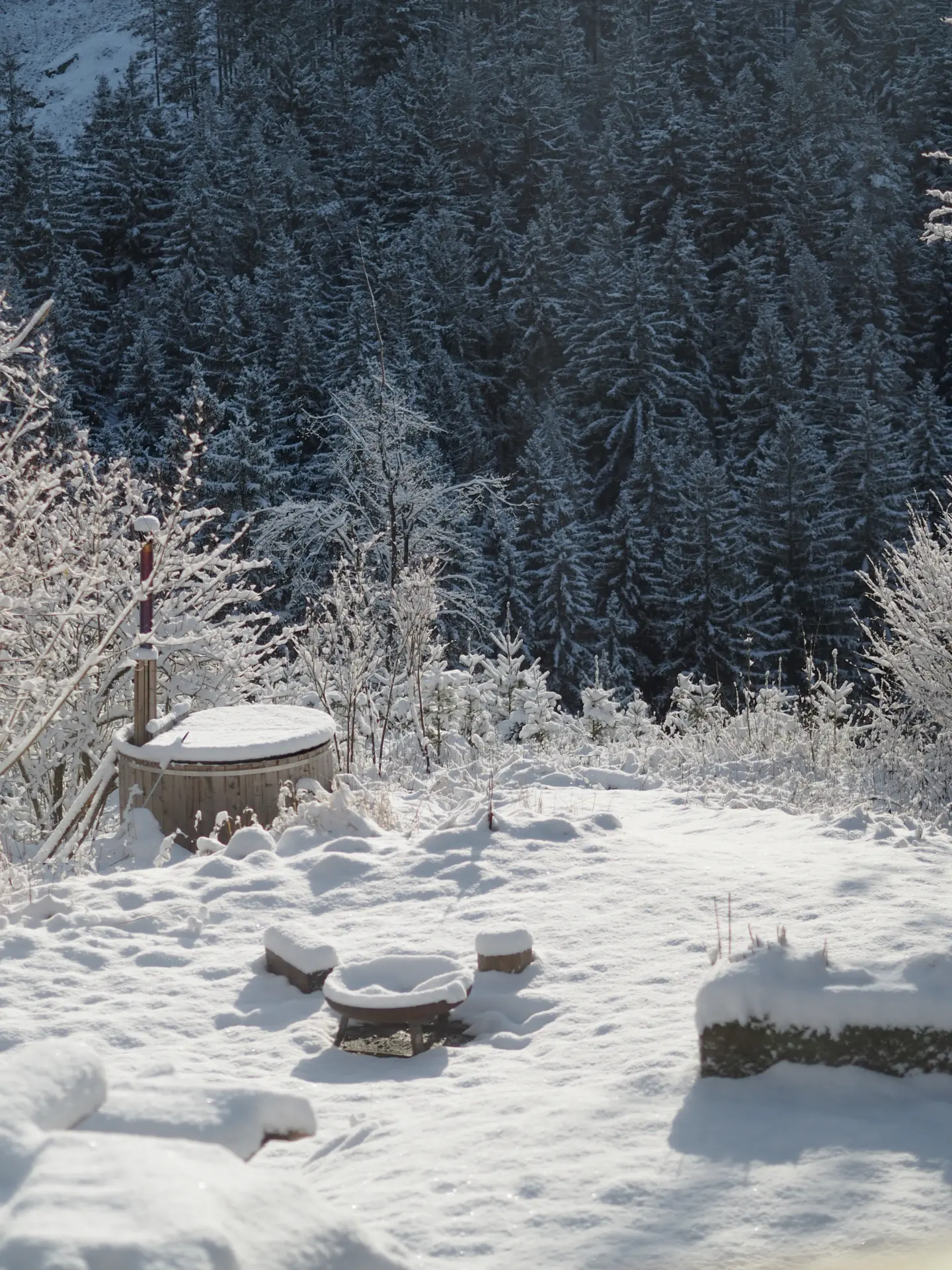 Na zahradě, na jejím úplném konci přímo nad lesem a údolím máme koupací sud, ve kterém si můžete zatopit dřevem. K dispozici jsou dvě terasy s posezením. Jedna kamenná hned u domu, jen pár kroků od kuchyně. Druhá ve spodní části zahrady vedle rozkvetlého záhonu a ohniště s grilem.